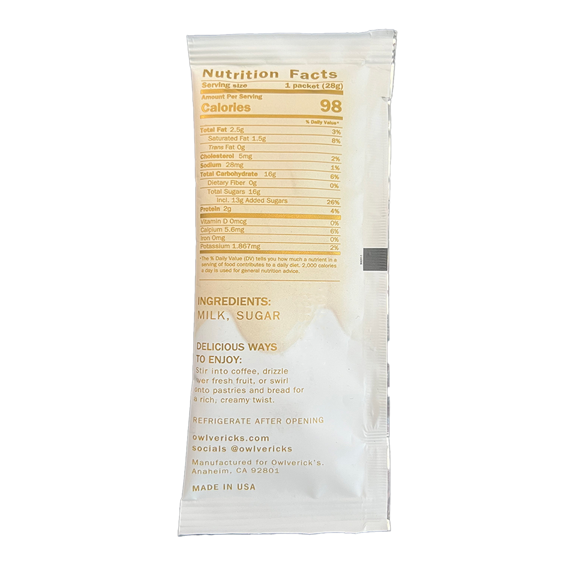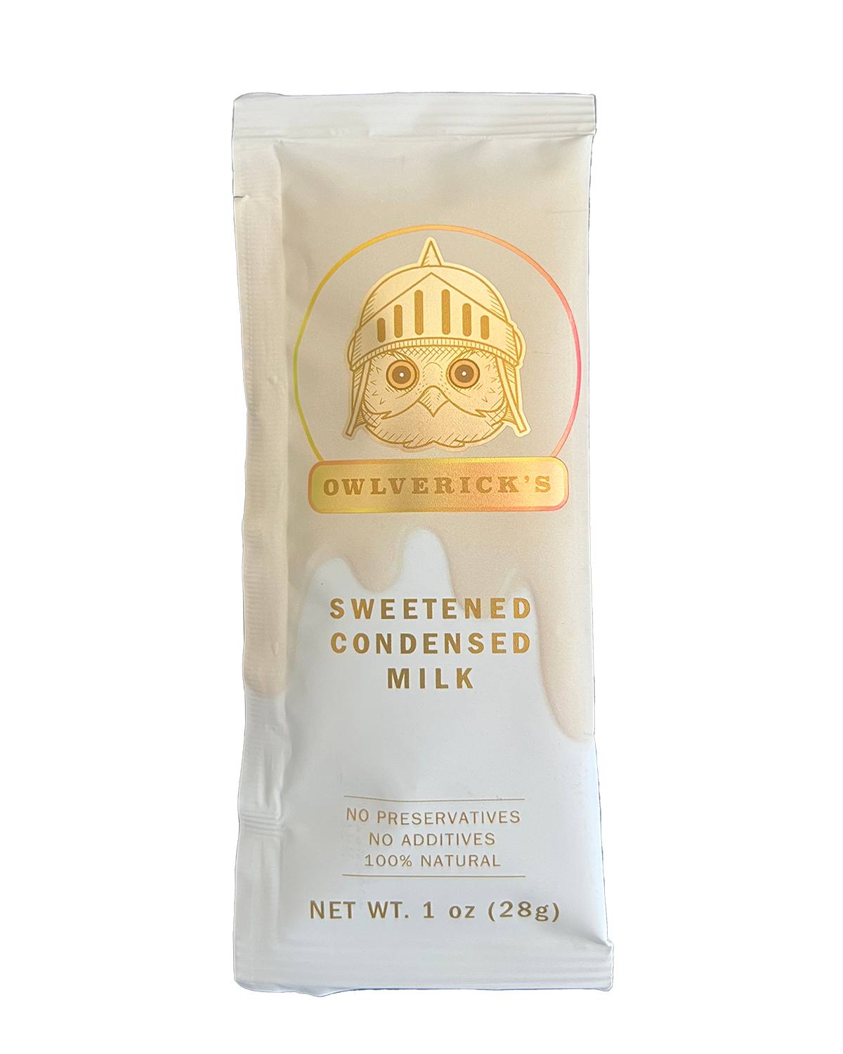 Say Goodbye to that half-used, sticky can of condensed milk sitting in your fridge! Owlverick’s Sweetened Condensed Milk Singles are here to make life sweeter and easier. Made in the USA with ONLY MILK and SUGAR – no preservatives, no artificial anything – these convenient little packets don’t require refrigeration, so you can stash them anywhere for whenever you need a touch of creamy sweetness.